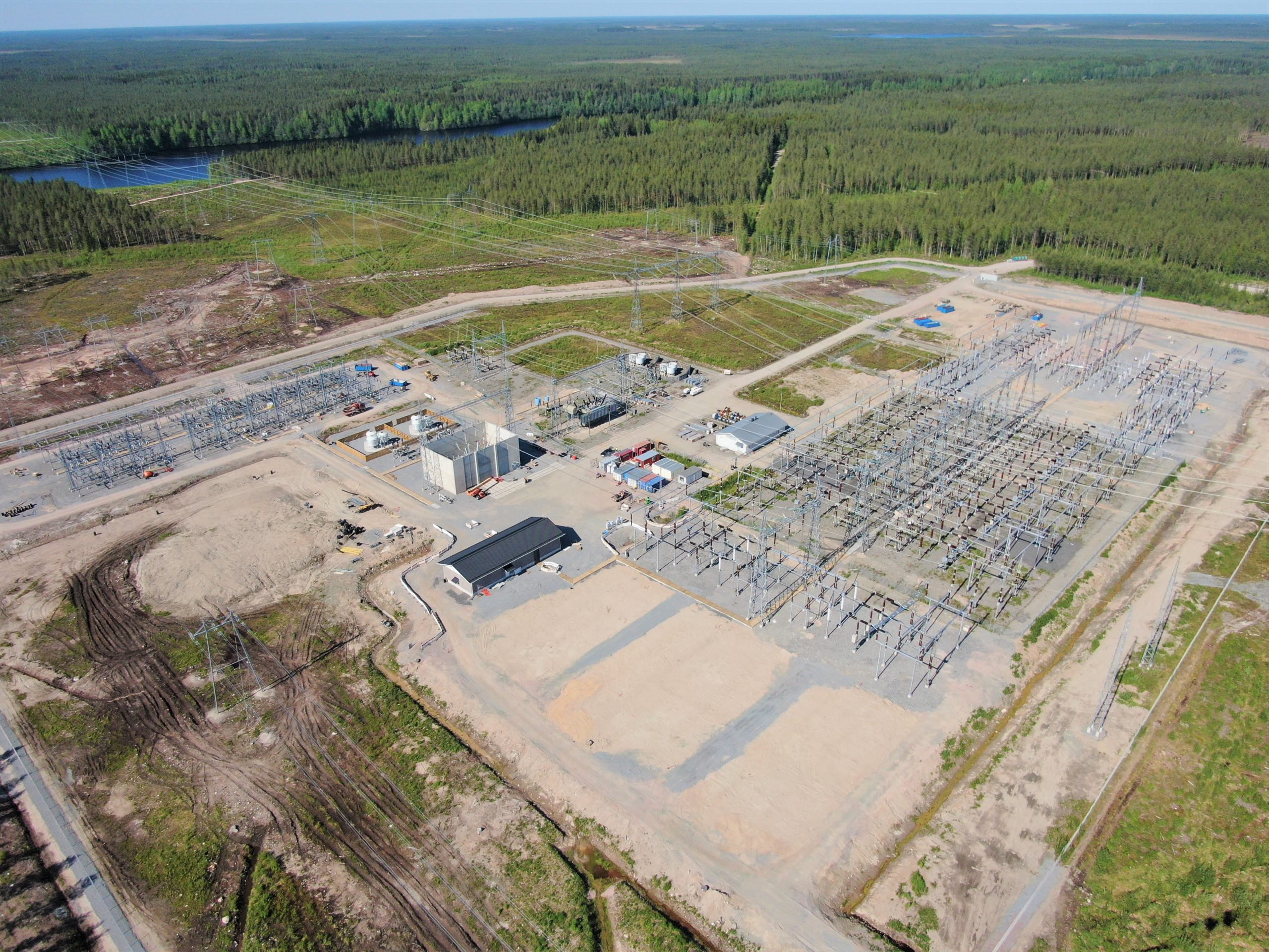 • Electrical substation site with steel structures, insulators, and transmission lines under construction