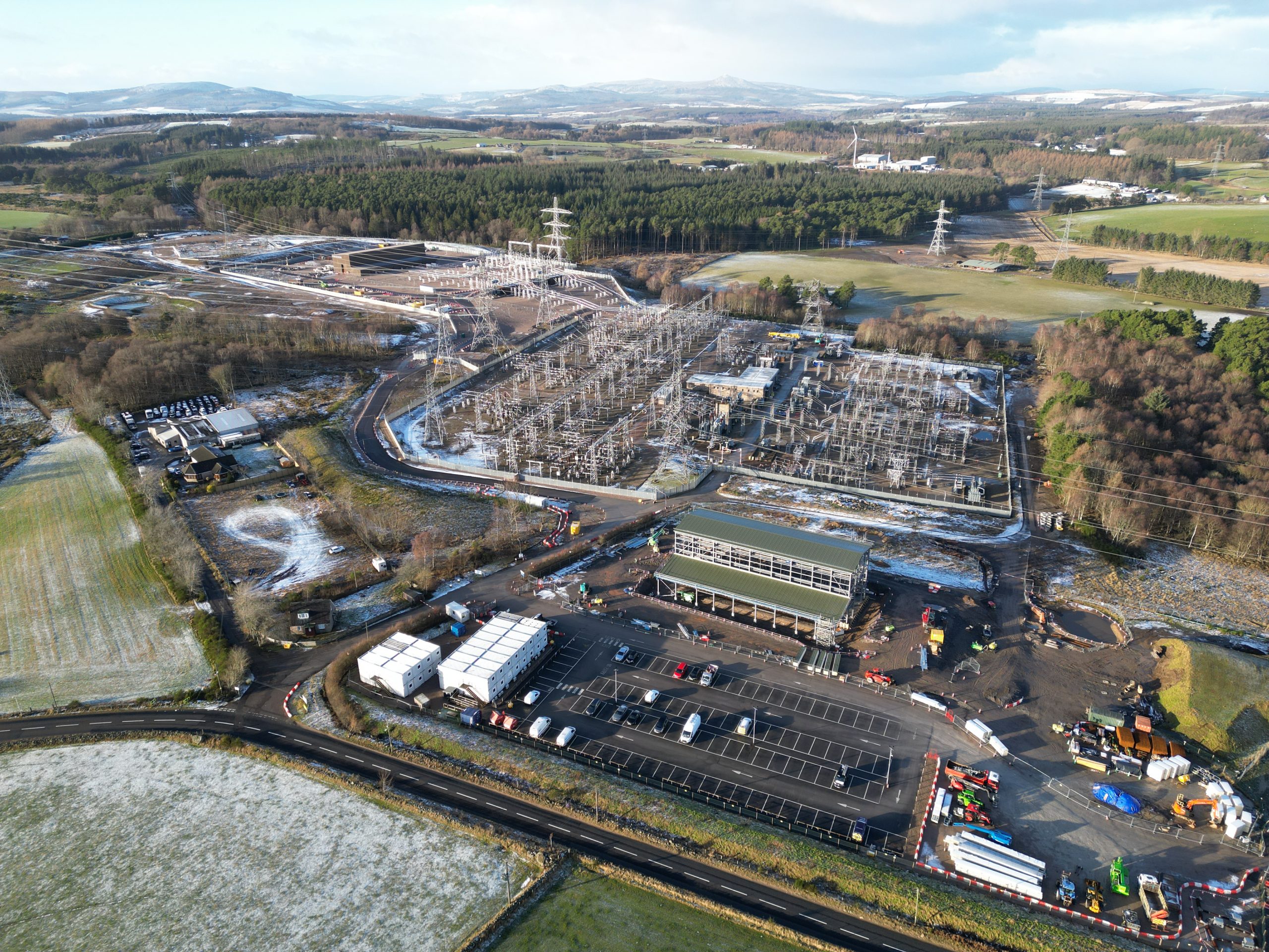 • Aerial view of an electrical substation in a winter landscape supplying regional power distribution