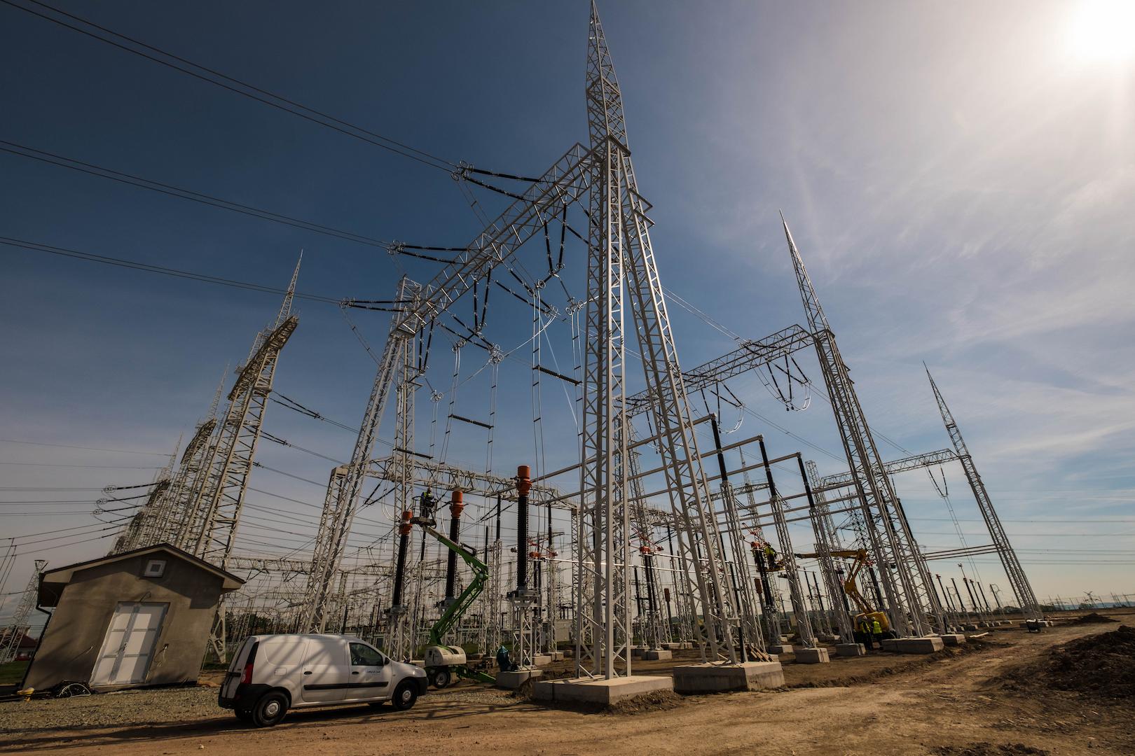 • High-voltage power lines and transmission towers connected to an electrical substation